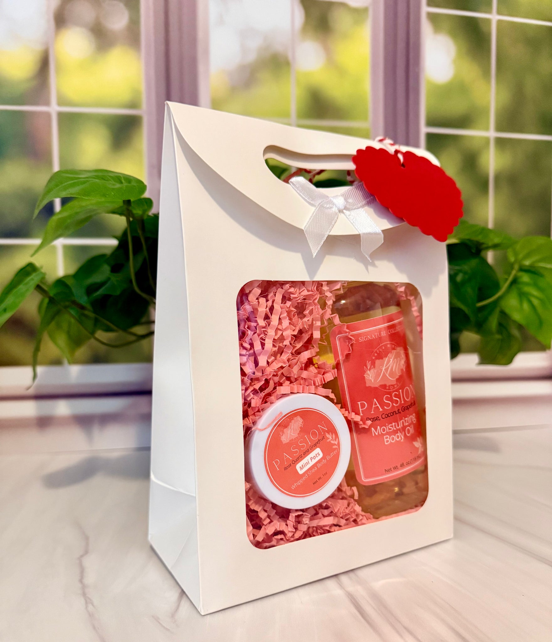 This gift set includes a Moisturizing Body Oil (4oz), and Mini Whipped Shea Body Butter (1oz) in the same fragrance packaged in a white tote bag with a clear window pane and heart-shaped gift tag.